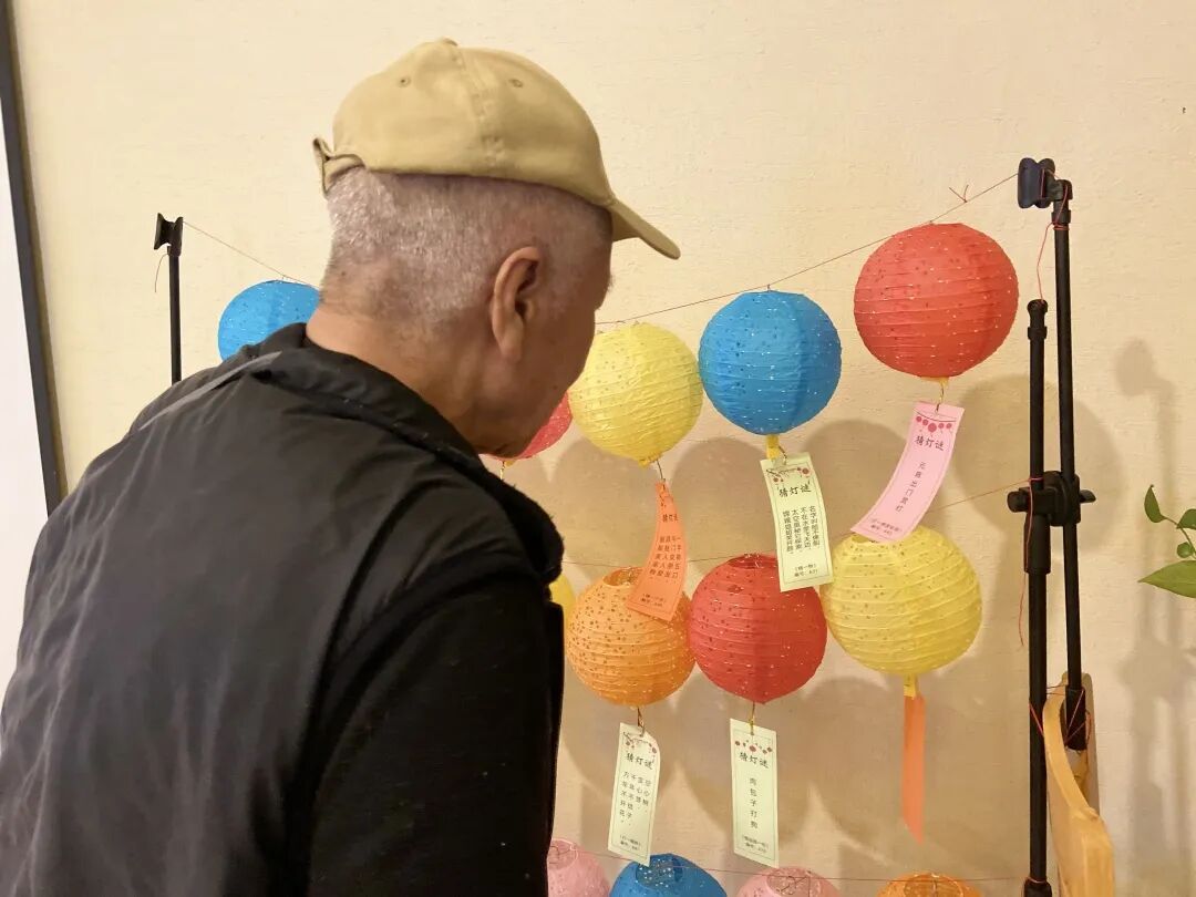 在游戏摊位上“猜灯谜”吸引了众多长者前来游玩。灯谜内容多样,涉及知识面广,有助于满足长者们对精神文化的需求。