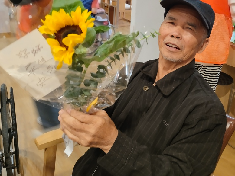 花束包好后,卢爷爷大声欢呼道"花好靓“,我们社工在一旁问道:“爷爷,那是花靓还是我靓呀?”:“花靓人更靓!”我们感叹道:“爷爷,真不愧是您呀,年轻时肯定是个情场浪子~~。”