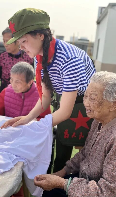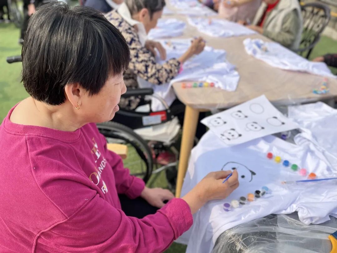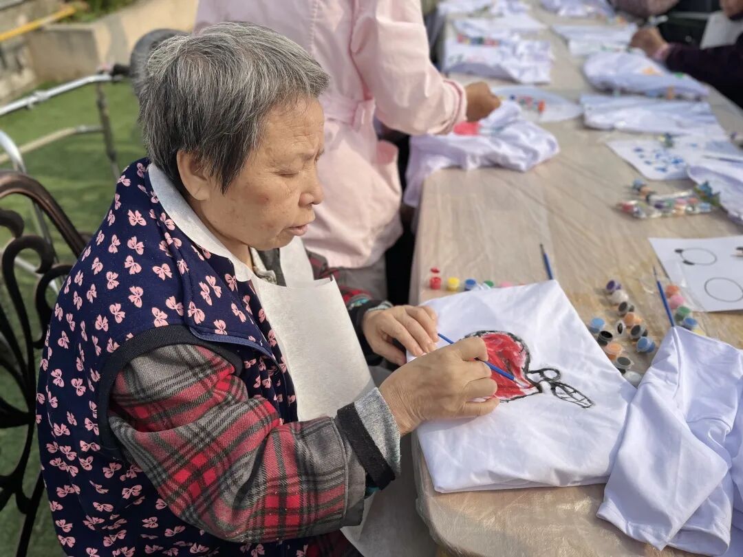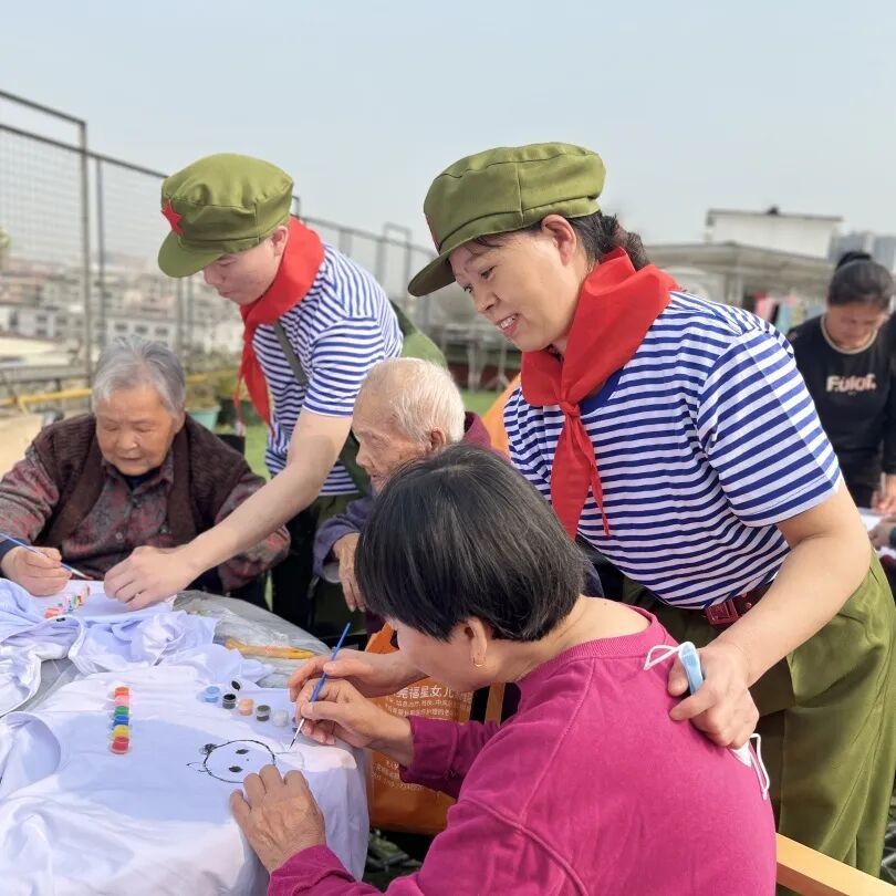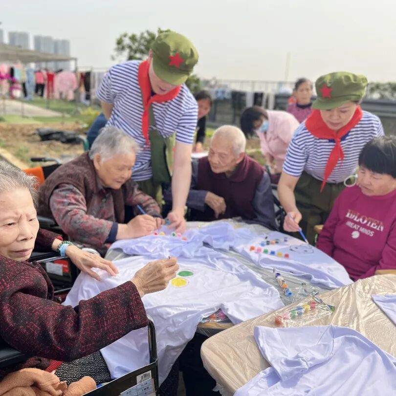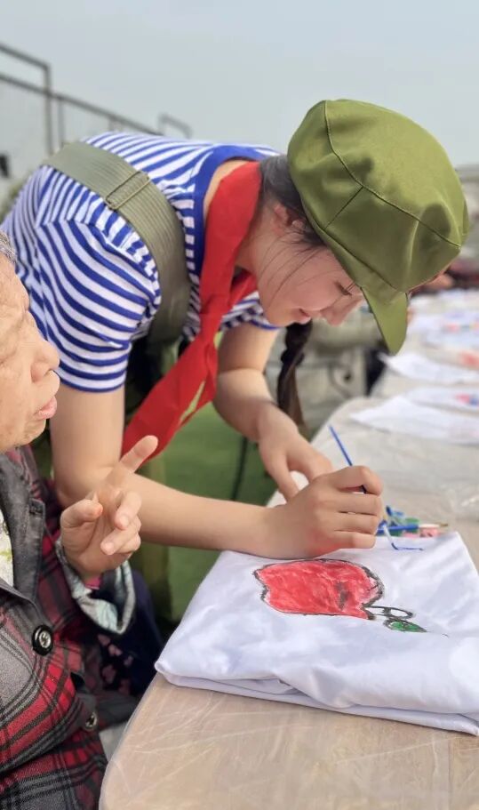 上午9:30分左右,活动正式开始,我们的工作人员也换上了80年代的知青服装,一起和奶奶们在衣服上进行手绘。