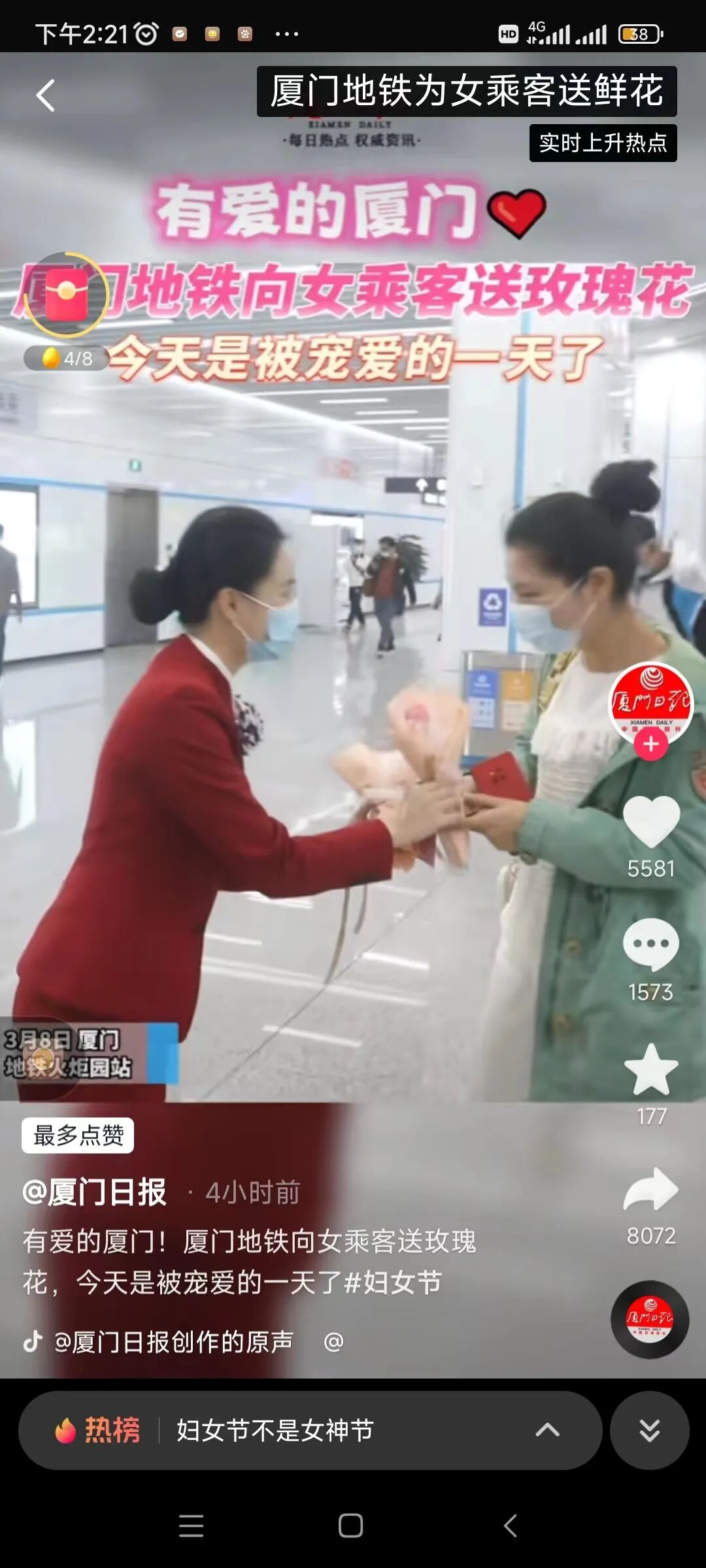 就在今天这个神圣的节日,中国各地都在用自己独特的方式为每一位女性庆祝这个意义非凡的节日——长沙一公交司机将公交装扮成移动版“浪漫满屋”、国网宝鸡供电公司工会男性职工反串跳舞庆祝妇女节、厦门地铁向女乘客送玫瑰花等,更是有公司在妇女节给女员工们放假6天。